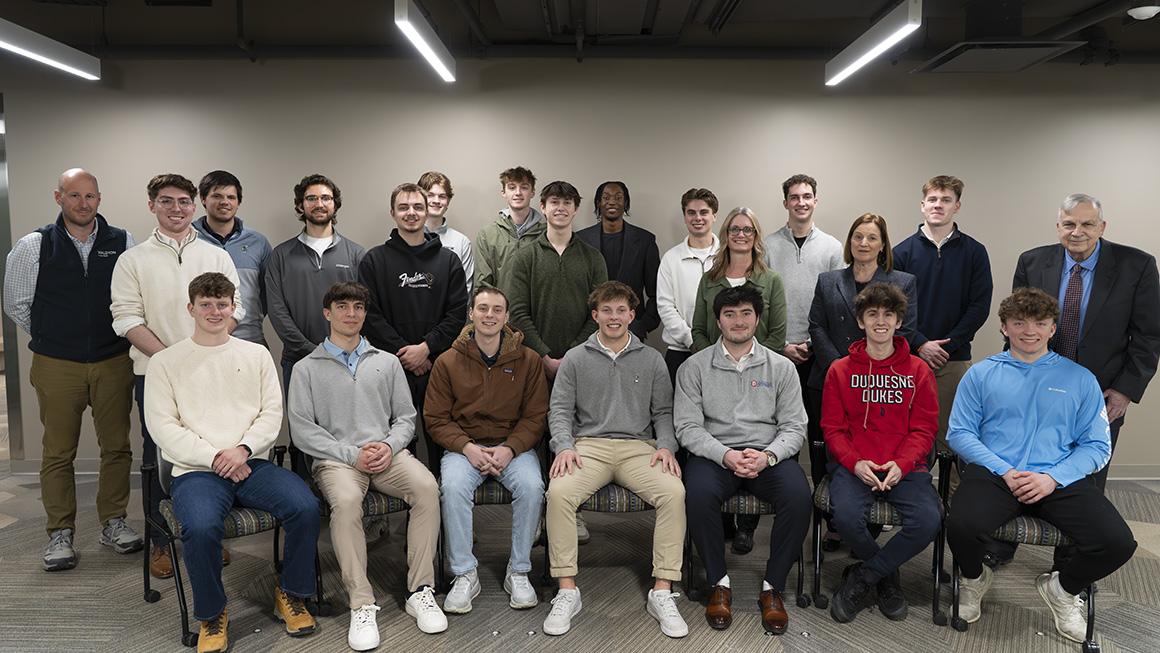 On February 26, 2026, members of the Asset Management Group @ Duquesne (DAMG) welcomed alumni Matthew Helfrich (B’03), CFP, CEO and Partner, and Nikolas Higgins (B’22), Client Service Specialist, for a discussion on careers in wealth management.